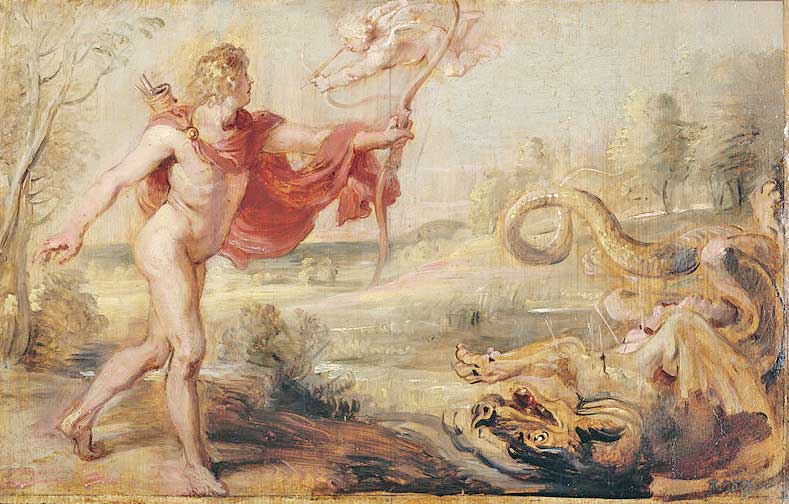 L’episodio rappresentato è quindi esattamente il momento in cui Apollo sta perdendo per sempre la donna di cui si è innamorato: ma come si è arrivati a un finale così tragico? La narrazione di questo episodio mitologico, raccontato nelle “Metamorfosi”di Ovidio, inizia con l’uccisione del serpente Pitone da parte di Apollo per mezzo di un arco. Questo si vantò dunque di fronte a Cupido, dio dell’Amore, della sua abilità nell’uso di questa arma, che non riteneva adatta per il dio dell’amore. Indignato, Cupido decise di dare ad Apollo la dimostrazione della potenza del suo arco scagliandogli una freccia che lo fece invaghire della ninfa Dafne, di cui tra l’altro era già innamorato ma da cui era stato rifiutato poiché questa prediligeva l’attività di caccia sul modello della dea Diana. Dafne, vedendosi inseguita, tentò di fuggire, mentre Apollo continuava ad inseguirla e a provare con le parole a convincerla senza un attimo di sosta, inarrestabile come l’amore di cui Cupido l’aveva dotato condannando lui e la ninfa a un triste destino. Dafne, sfinita, giunse alle rive del fiume Peneo, dove in preda alla disperazione chiese al padre di essere trasformata in una pianta di alloro. È proprio questo l’istante raffigurato nell’opera di Bernini, il momento in cui Apollo ha finalmente la sua amata tra le braccia, ma lo stesso in cui la sta irrimediabilmente perdendo per sempre. È il momento in cui Apollo si accinge ad abbracciarla, ma le mani di Dafne si stanno già trasformando i foglie e i suoi piedi in radici.